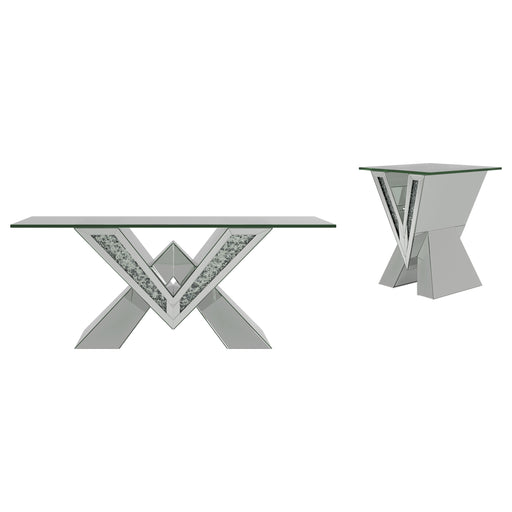 This mirrored coffee table set brings modern luxury to any living space. Featuring a coffee table and matching end table, both pieces boast bold V-...