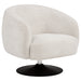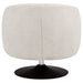 Elevate your seating area with this stylish swivel accent chair that blends modern sophistication with retro charm. Wrapped in soft beige boucle fabric, it offers a tactile texture and inviting comfort. The barrel-back silhouette features a tailored seat and gently curved arms for a clean, contemporary look. Supported by a matte black pedestal base, the chair rotates a full 360 degrees for effortless movement. Perfect for a living room or reading nook, it combines comfort, versatility, and modern flair. Key Features: • Swivel accent chair with stylish barrel-back silhouette and retro appeal • Soft beige boucle upholstery offers tactile texture and inviting comfort • Matte black pedestal base adds a sleek, modern contrast beneath seat • Full 360-degree swivel motion ensures smooth effortless mobility • Tailored tight back and seat provide clean lines and structured support • Durable metal, plywood, and larch frame ensures lasting stability