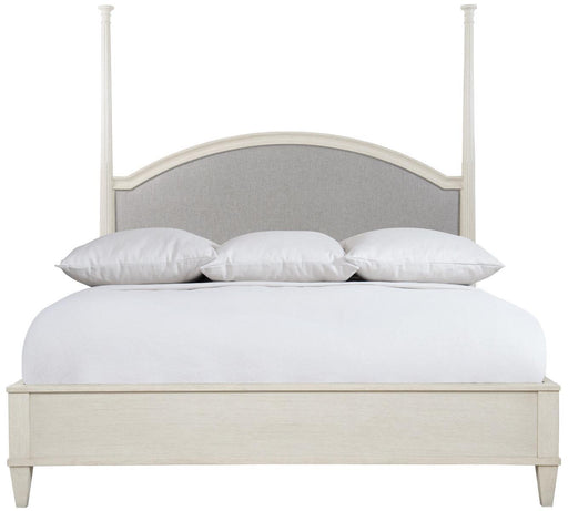 Allure Collection by Bernhardt Manor White and Silver Luster Upholstered headboard Wood-framed high post headboard with arched center Wood low-pro...