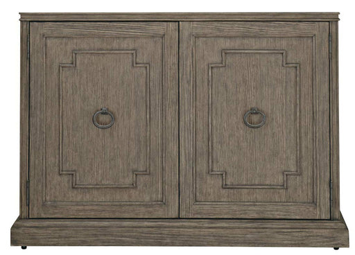 Canyon Ridge Collection by Bernhardt Furniture Wire-brushed in Desert Taupe finish 2 Wood-framed doors with inset seeded glass panels Cast grill...
