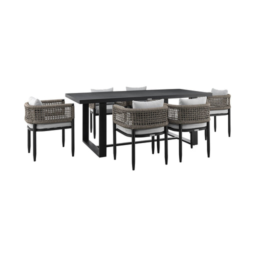 Introducing the Zella Outdoor Patio 7 Piece Dining Set in Aluminum with Light Gray Rope and Cushions - a perfect fusion of modern design and outdoo...