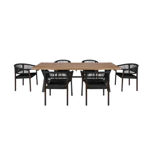The Fineline and Clip Indoor Outdoor 7 Piece Dining Set in Dark Eucalyptus Wood with Super Stone and Black Rope is a durable and fashionable additi...