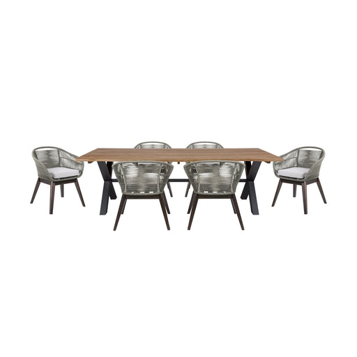 The Crown 7 Piece White Aluminum and Teak Outdoor Dining Set with Light Gray Fabric from Armen Living will bring a clean, sleek, and modern aesthet...