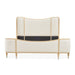AICO Furniture Camellia Field King Upholstered Panel Bed in Caramel. Transform your bedroom into a sanctuary with this exquisitely designed bed. The graceful curves of the headboard and footboard are framed by a warm walnut finish, creating a sense of refined charm. Upholstered panels in a luxurious chenille fabric provide softness and texture, while built-in USB ports add modern functionality. Tapered legs with gold accents complete the look with a subtle touch of luxury. A timeless centerpiece for any serene retreat.