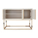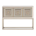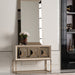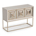 AICO Furniture Madison Small Console with Leg in Glistening Gold LFR-MDSN050-827. This console is a trio of doors, graced with bronzed mirrored accents, casting tantalizing reflections that add captivating dimensions to your room, transforming ordinary spaces into intimate mysteries of glamour.