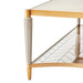 AICO Furniture St.Charles Rectangular Cocktail Table in Dove Gray 9088201-803. The Saint Charles Cocktail Table is a centerpiece that commands attention, distinguished by its intricate etching on the tinted glass shelf beneath. This feature not only adds visual interest but also a layer of sophistication to the piece. The Dove Gray finish on the wooden top is complemented by the bronze frame, making this table a blend of traditional craftsmanship and modern design.