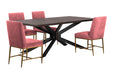 The Pirate and Pink Memphis 5 Piece Modern Dining Set promises an unmatched degree of comfort and dependability, making it an ideal choice for the contemporary dining room. The Pirate modern design boasts a black intricate pedestal wood base, brilliantly complemented by the table's stylish Acacia wood rectangle top design. With foam padded seat and back, the Memphis offers a supportive frame wrapped in a sophisticated pink velvet package.