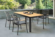 The Armen Living Portals Outdoor 5-piece Dining Table Set with Table and 4 Chairs In Dark Finish is a great choice for any outdoor space. The frame of this dining table is constructed from aluminum and teak wood in a natural finish, holding up against even the strongest elements. The Portals Outdoor Dining Chairs in Black Finish and Teak Armrest in Set of 2 feature a unique back style that is sure to please and have removable cushions.