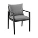 The Cayman dining set features a black powder coat finish and dark gray upholstery, the dining chairs have a 19-inch seat height and can support up to 308lbs per seat.