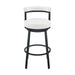 The Reuben swivel counter or bar height stool is available in 26 inch or 30 inch seat height and comes in a black finish with gray faux leather upholstery, a mocha finish in brown faux leather upholstery, or a cloud finish with white faux leather upholstery.