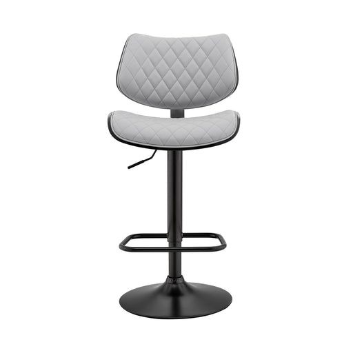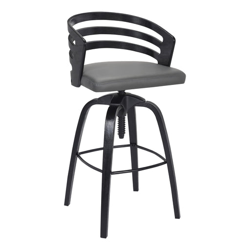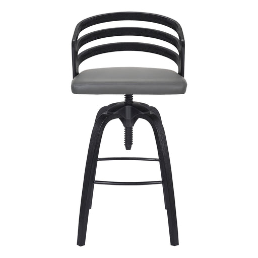 Style and function come together in the creation of the Jacob Adjustable Swivel Gray Faux Leather and Black Wood Bar Stool with Black Base from Arm...