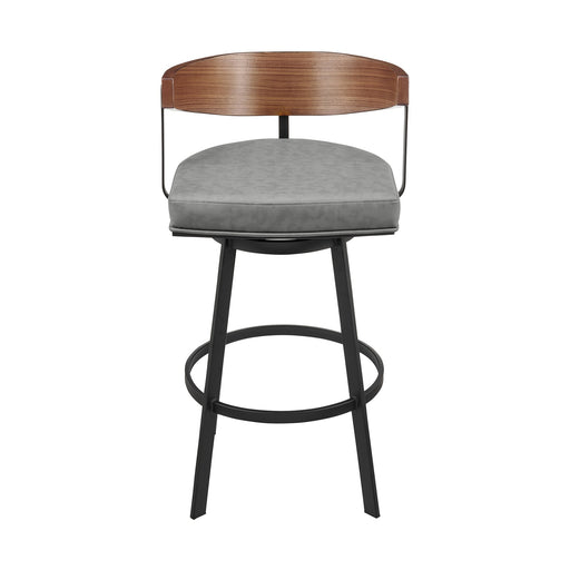 The Jayden 26" Counter Height Swivel Gray Faux Leather and Walnut Wood Bar Stool from Armen Living adds a touch of mid-century modern appeal to any...
