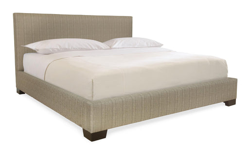 Linea Collection by Bernhardt Furniture Cerused Griege finish Wood-framed headboard Upholstered inset panel containing 5 horizontal channels Wood ...
