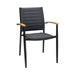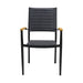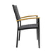 The Portals Outdoor Black Aluminum Stacking Dining Chair with Teak Arms - Set of 2 is the best chair for your outdoor area. The strong aluminum frame is perfectly capable of handling wear and tear and any form of weather. The back and seat materials are constructed from PVC - coated yarn that is finely woven together to create the perfect solution for outdoor seating, bringing high strength and elasticity, and providing optimum comfort and durability.