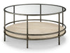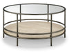 Elevate your space with a stunning collection of mixed media and pulling together a warm modern flare. The rounded shaping of both the frame and metal accents brings a softness to the hard elements. Glass top creates a nice open ambience allowing light to pass through to the wire brushed pine shelf. Play on finish with the natural pine and vintage bronze metal finish creates good contrast directing your eye to flow around the table and see all the details! Standout features include a nesting end table for added convenience and space-saving and a round cocktail table that serves as a centerpiece and and a demilune sofa table that adds a touch of elegance to any entryway. Make a statement in your home with this sleek and stylish collection.