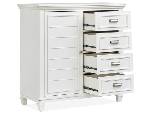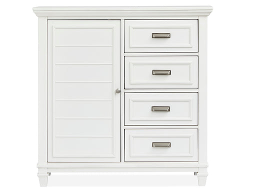 Harper Springs Collection by Magnussen Furniture Silo White finish 5 drawers with felt lined top drawer on the left 1 wood door on the right 2 adj...