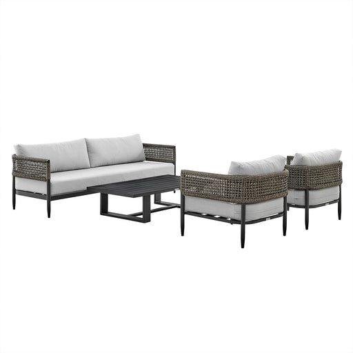 The Algeria 4 Piece Outdoor Rope and Aluminum Black Seating Set with Light Gray Cushions from Armen Living will mark all the boxes for a perfect ou...