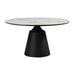 This tabletop is resistant to etching, scratches, burns, and stains as a durable yet elegant alternative to quartz. It is perched upon a black metal base to attain contrast and a versatile appeal. The round dining table can comfortably seat up to six individuals for enjoying meals in your kitchen, dining room, or living space. A 55” round shape allows the table to function as a natural hub for conversations.