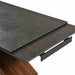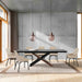 A durable yet elegant alternative to quartz, this tabletop is resistant to etching, scratches, burns, and stains. It is perched upon a cross-shaped base to capture the eye. The chunky wooden leg is covered in walnut veneer, creating a visual contrast with the airy black wooden frame. Our chic and stylish dining table can easily extend to comfortably seat up to six to eight individuals.