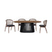 The Pasadena Echo dining set is available in an all-black finish with black faux leather upholstery, a black finish table with walnut chairs and black faux leather upholstery, or a black base table with walnut tabletop and chairs with black faux leather upholstery.