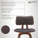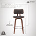The Pico bar or counter stool is available in your choice of a walnut wood finish with gray, cream, or brown faux leather upholstery and chrome footrest, or a black wood finish with gray faux leather or light gray fabric upholstery and black footrest.