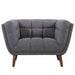 The Phantom accent chair is outfitted with a flared out walnut wood legs and is upholstered in Dark Gray linen with tufted back and seat cushions that makes room for other hues of colors to be incorporated. It comes in a sofa and loveseat, which can be combined for a harmonious collection.