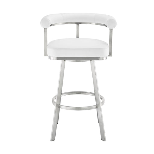 The Carise 30" White Faux Leather and Brushed Stainless Steel Swivel Bar Stool from Armen Living is a fashion-forward work of art that will update ...