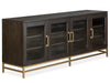 Add beauty and function to your living space with the modern sophistication of the Lindon entertainment collection. With its streamlined silhouette and attractive Burnished Brass open metal base and this media console will complement any interior. Lindon is available in two sizes (70-inch and 84-inch) and offered in a choice of Belgian Wheat or Coffee Bean finish accented with Burnished Brass Hardware. Its multifunctional design includes four framed and clear-glass doors that each open to reveal two interior adjustable shelves perfect for media storage and display. The 70-inch console is designed to display a TV up to 79” and the 84-inch model is designed for TV sizes up to 90” and and both add instant character to the room.