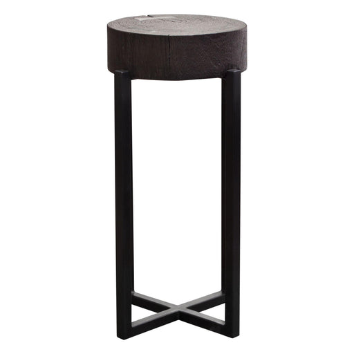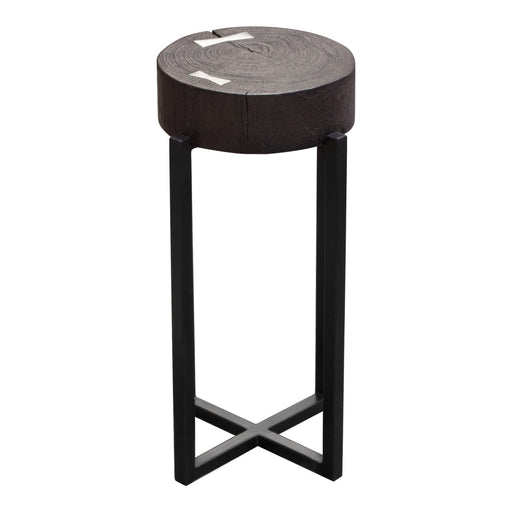 The Alex Small Accent Table features a round Solid Mango Wood Top in Espresso finish w/ Silver Metal Inlay accent detail atop an Iron criss-cross b...
