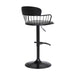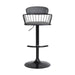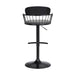 The Nash adjustable bar or counter stool easily incorporates into any home and is available in your choice of light gray or blue fabric upholstery or gray faux leather upholstery with a black wood finish and black metal base.