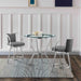 The mixture of the glass, wood, and metal materials gives you an eclectic style without compromising its refined design. The Livingston and Naomi counter height dining set features a brushed stainless-steel frame, glass tabletop, gray faux leather upholstery and a black wood back accent on the bar stools. This 3 – piece dining set includes 1 round bar table, and 2 counter height bar stools. The Livingston bar stools have a 26 inch seat height and can support up to 250lbs per seat.
