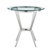 The Naomi Bar Table from is a contemporary piece that adds a touch of pure sophistication to any kitchen, bar, or lounge area, or even a breakfast nook. It features a strong and striking stainless steel x-shaped base, giving it a sleek and stunning visual. The round tempered glass top completes the elegant look, while also contributing to the durability of this piece. This glass and metal dining set is ideal for meals, cocktail hours, card games, and more!