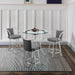 The mixture of the glass, wood, and metal materials gives you an eclectic style without compromising its refined design. The Livingston and Naomi counter height dining set features a brushed stainless-steel frame, glass tabletop, gray faux leather upholstery and a black wood back accent on the bar stools. This 4 – piece dining set includes 1 round bar table, and 3 counter height bar stools. The Livingston bar stools have a 26 inch seat height and can support up to 250lbs per seat.