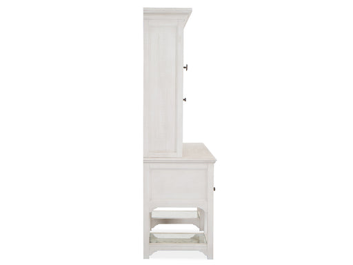 Lancaster Collection by Magnussen Furniture Dove Tail Grey finish Made up of pine veneers and solids Weathered bronze hardware 4 Removable shelves