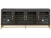Add beauty and function to your living space with the modern sophistication of the Lindon entertainment collection. With its streamlined silhouette and attractive Burnished Brass open metal base and this media console will complement any interior. Lindon is available in two sizes (70-inch and 84-inch) and offered in a choice of Belgian Wheat or Coffee Bean finish accented with Burnished Brass Hardware. Its multifunctional design includes four framed and clear-glass doors that each open to reveal two interior adjustable shelves perfect for media storage and display. The 70-inch console is designed to display a TV up to 79” and the 84-inch model is designed for TV sizes up to 90” and and both add instant character to the room.