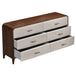 AICO Furniture Houston Dresser in Walnut 9095050SA-416. The Houston Dresser balances contemporary sophistication with a relaxed aesthetic. Its walnut-finished wood frame is complemented by striking gray drawer fronts, each adorned with a starburst pattern that adds depth and texture. Sleek, tapered handles combine wood and metal for a refined contrast, while rounded corners soften the dresser's modern silhouette. Six velvet-lined drawers with soft-close glides provide effortless storage, and a hidden lift-up compartment in the bottom right drawer offers a discreet space for valuables.