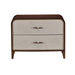 AICO Furniture Houston Large Nightstand in Walnut 9095042-416. The Houston Nightstand blends contemporary sophistication with effortless functionality. Framed in a rich walnut finish, its sleek silhouette is softened by rounded corners, while the textured gray drawer fronts feature a refined starburst pattern accented with gold trim. Two velvet-lined drawers with soft-close glides offer ample space for bedside essentials, while the spacious top provides the perfect surface for a lamp or decorative accents.
