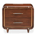 AICO Furniture Mason Park Nightstand in Umber 9094040-406. The Mason Park Nightstand blends a sleek design with practical features. Finished in a warm walnut veneer with gold mylar accents, this piece brings modern elegance to your bedside. Its multi-stage LED light offers tailored illumination, and stunning handles make every detail feel special.