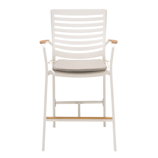 Revamp the appearance of your outdoor dining space with this Portals Outdoor Arm Barstool in Light Matte Sand with Natural Teak Wood Accent Finish....