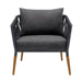 The Ipanema Outdoor 4 Piece Rope and Teak Sofa Seating Set with Dark Gray Olefin from Armen Living an alluring, sleek, and unique outdoor set that will absolutely liven your outdoor patio area. The chair and sofa feature rope cording, which is made from strong olefin yarn, offering high performance in all weather conditions. It is handwoven by skilled craftsman to create seating that is sumptuous and supportive with a unique, eye-catchingly contemporary look.