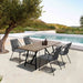 The Frinton’s trestle base allows for maximum seating space as it makes the table virtually legless and allows for the full surface of the table to be used and no corner legs that would limit dining chair space. The Frinton rectangle dining table is 71 inches long and features a convenient umbrella hole to keep you out of the sun. The Clip chairs feature an intricately woven rope seat and back that offer extreme comfort and relaxation.
