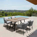 The Frinton’s trestle base allows for maximum seating space as it makes the table virtually legless and allows for the full surface of the table to be used and no corner legs that would limit dining chair space. Steel does not dent or get bent out of shape as easily as some aluminum furnishings can. Lighter than wrought iron but heavier than aluminum, steel provides strength, stability, and endurance in extreme temperatures.