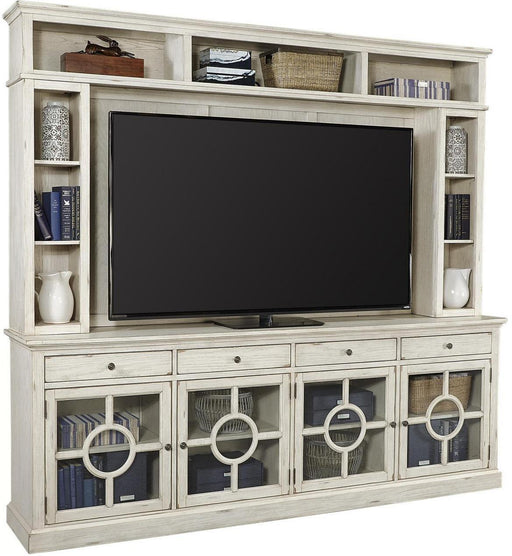 Radius Collection by Aspenhome Furniture White finish 4 Doors Doors have glass inserts Engineered to allow cords to pass through the furniture to ...