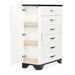 AICO Furniture Tuxedo 6 Drawer Chest in Piano Keyboard 9087070SA-832. Organize in opulence with the Tuxedo 6-Drawer Chest, a testament to sleek, functional design. This exquisite chest combines the clean lines and contrasting tones of the Piano Keyboard finish and white anigre veneer. Each drawer features a soft-closing mechanism, ensuring seamless and quiet operation, while the unique stainless steel handles echo the refined style of a Tuxedo, adding a contemporary edge to this classic piece.