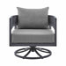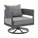 The Menorca 3 Piece Patio Outdoor Swivel Seating Set in Dark Gray Aluminum with Gray Cushions elevates the style of any outdoor space. The 360-degree swivel and rocking motion allows optimal mobility and convenience. Featuring a modern and elegant design, this outdoor furniture set remains a versatile addition to any setting. This swivel chairs embrace a barrel silhouette to wrap you in comfort. The dark gray cushions are removable and feature a zipper closure, making clean up a breeze!