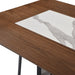 - White sintered stone center framed by walnut-toned wood stain-resistant and durable with a naturally elegant look.