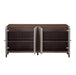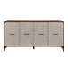 AICO Furniture Houston Sideboard in Walnut 9095007SA-416. The Houston Sideboard blends contemporary elegance with versatile storage. Framed in a rich walnut finish, its contrasting gray door fronts showcase a delicate starburst pattern with a subtly textured surface. A refined gold trim outlines the piece, enhancing its sophisticated silhouette. The sleek, tapered handles combine wood and metal for a modern, tailored touch. With ample storage and thoughtful details, this sideboard brings both function and style to any dining or living space.