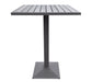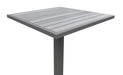 The bar table features a square base and stylish teak wood top, ideal for stacks and drinks. The Marina set is available in a gray powder coated finish and gray upholstery.