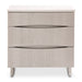 AICO Marin Nightstand in Greige KI-MRIN040R-139. The Marin nightstand is simple yet elegant with its cultured marble top and stainless-steel accents. The three velvet lined drawers with self-closing glides are the perfect place for convenient bedside storage.