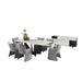 - 8-piece set with white glass table, gray chairs, and 3-door sideboard cohesive design with functional sophistication.
